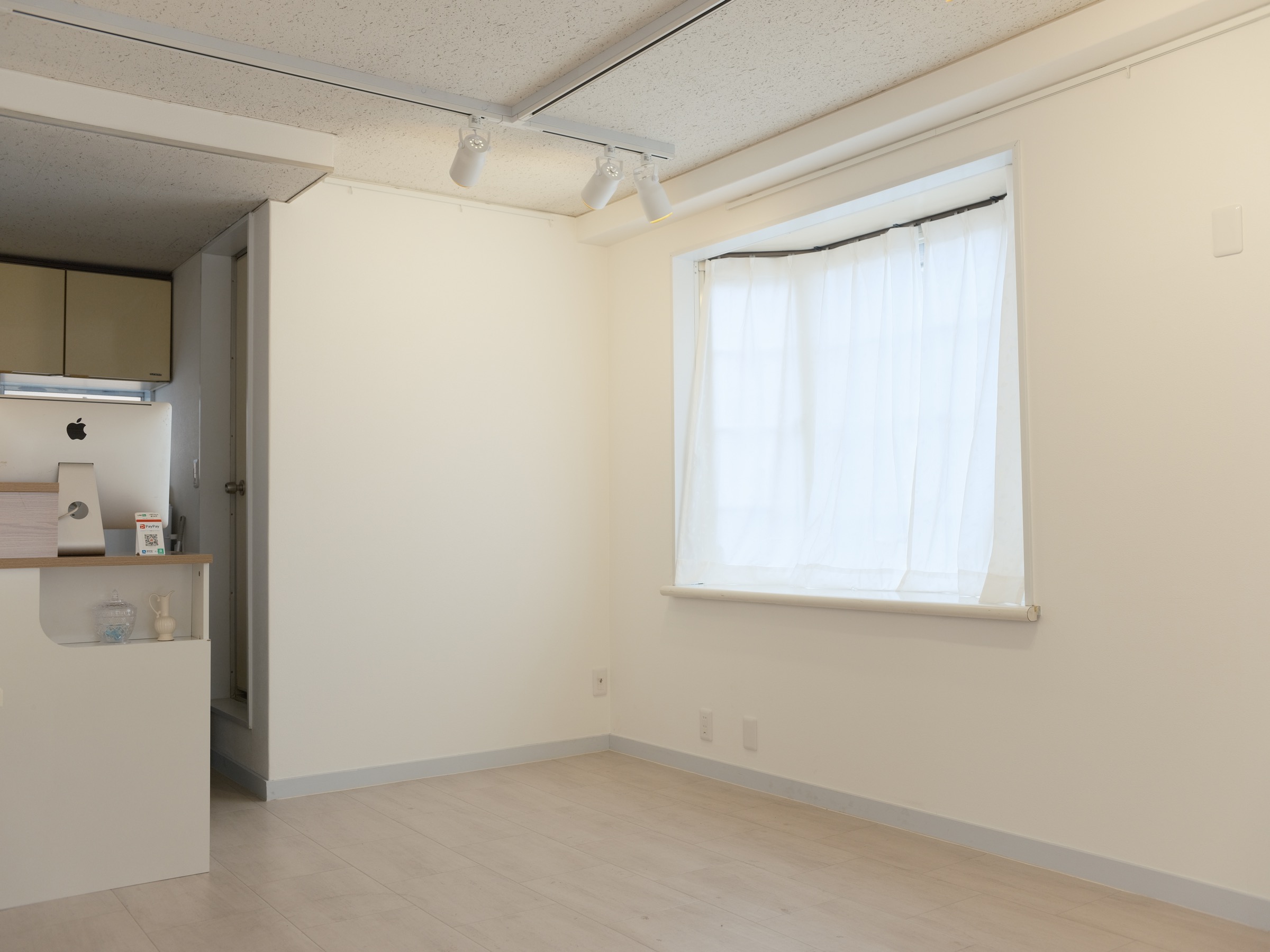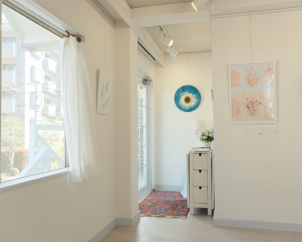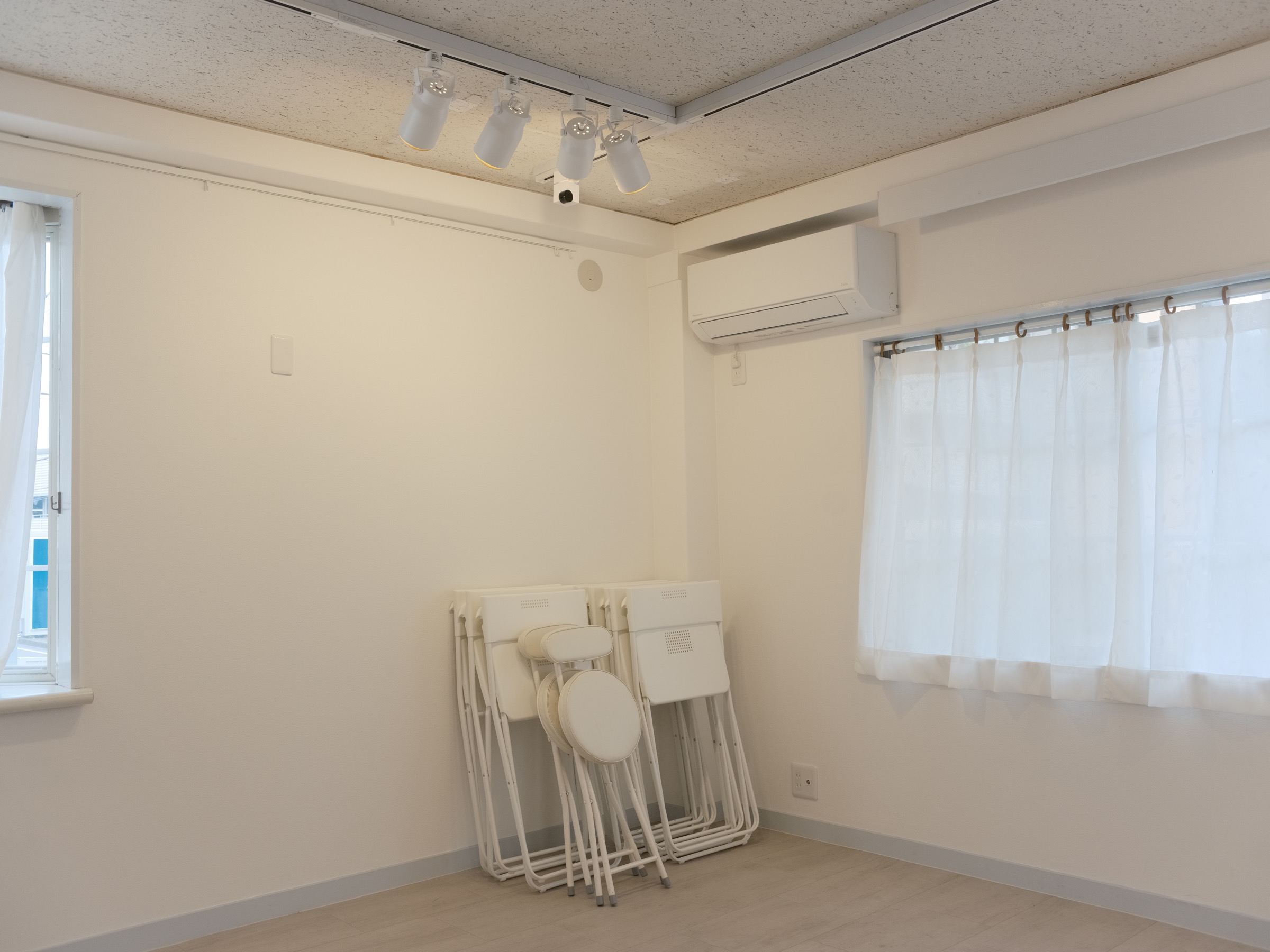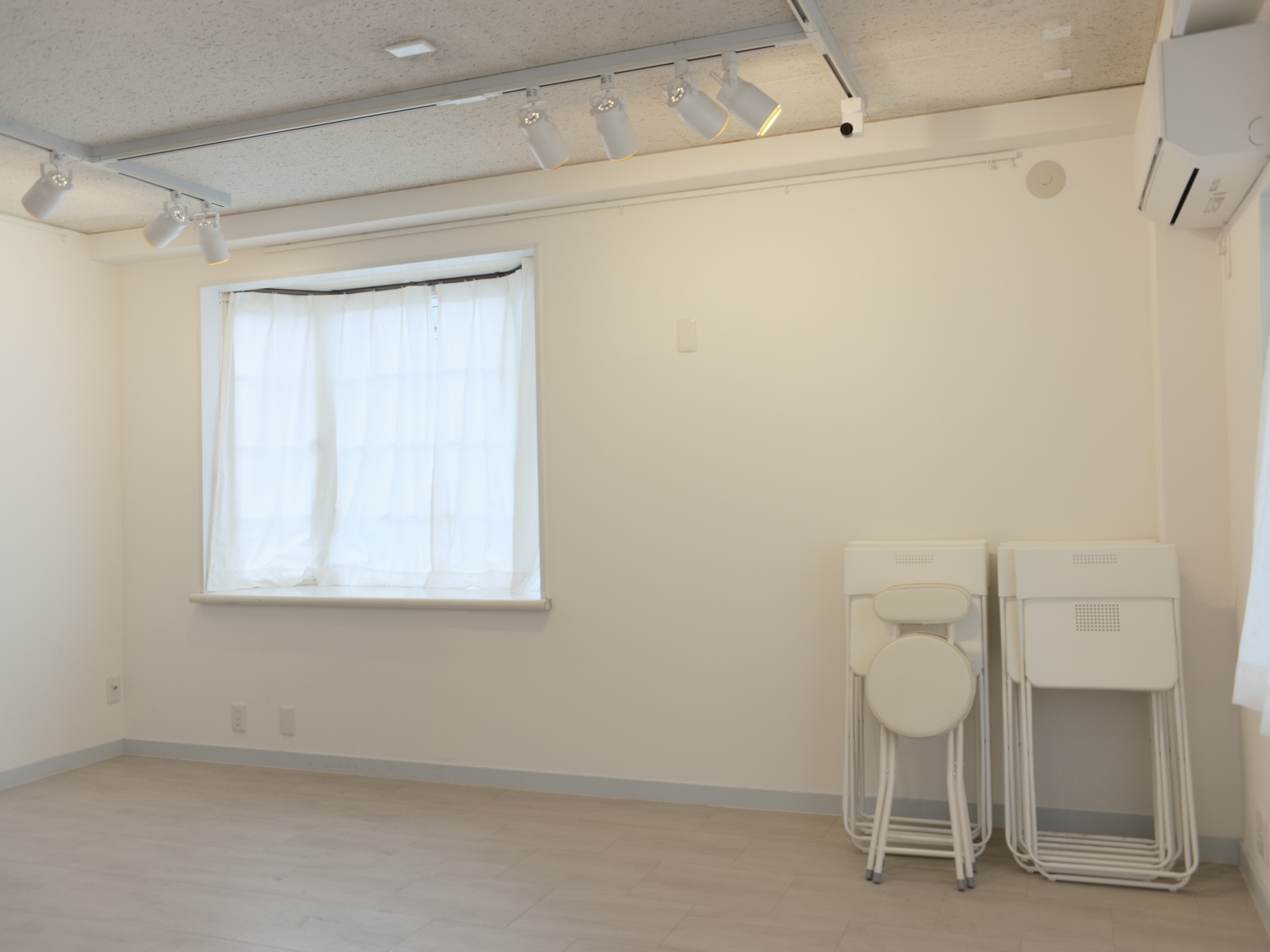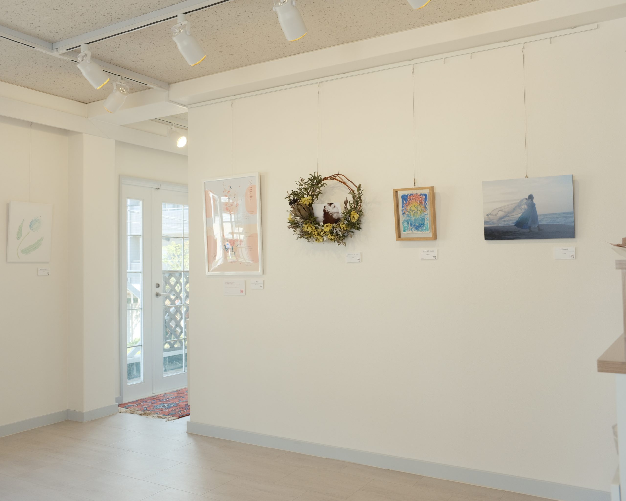 白い壁と木の床、自然光がふんわり差し込む空間は、写真・絵画・イラスト・立体作品など、あらゆる表現にフィットします。